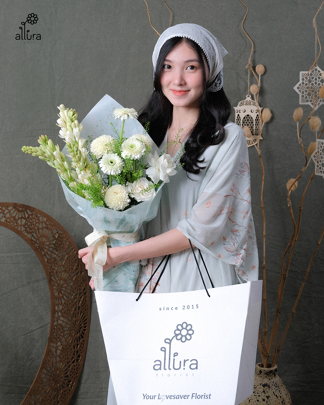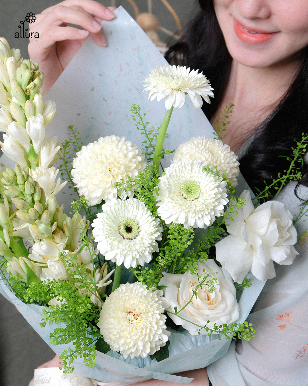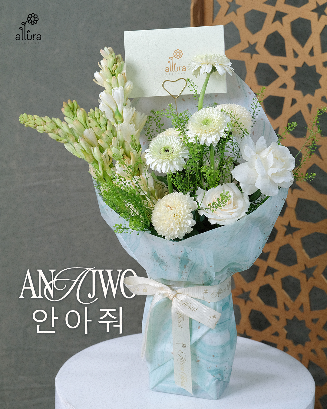 Anajwo (안아줘) means “Hug Me” this is A graceful Eid bouquet featuring fragrant tuberose, beautifully paired with soft roses , gompie, and fresh daisies. Delicate yet expressive, Anajwo symbolizes warmth, comfort, and the gentle embrace we long for during Raya.