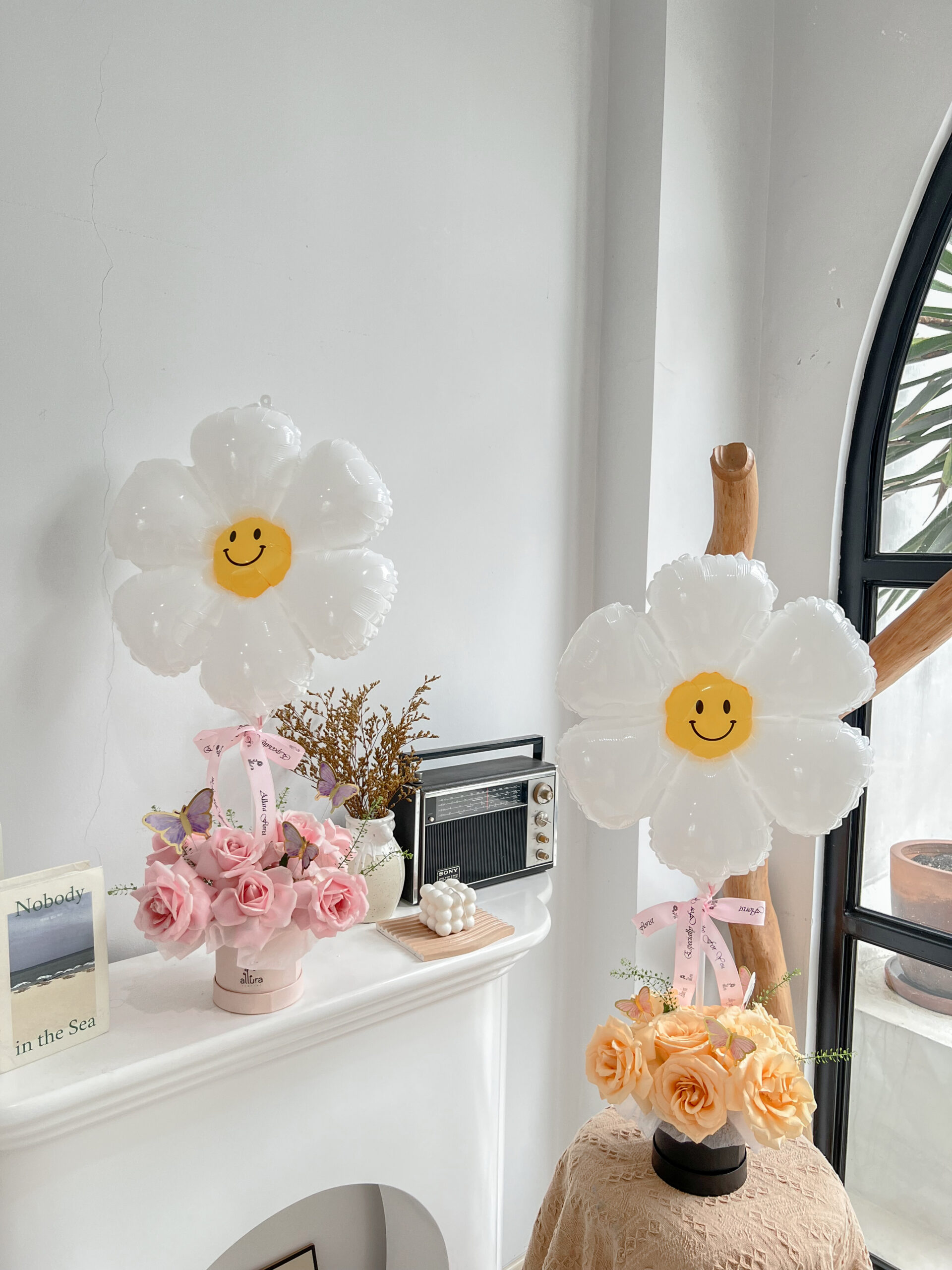 Semi import classic rose with butterfly  in a box, completed with Daisy Balloon Flower. Perfect to make your beloved smiling :) Diameter box : 10 cm , flower arrangement made beyond diameter box. You can choose your fav color