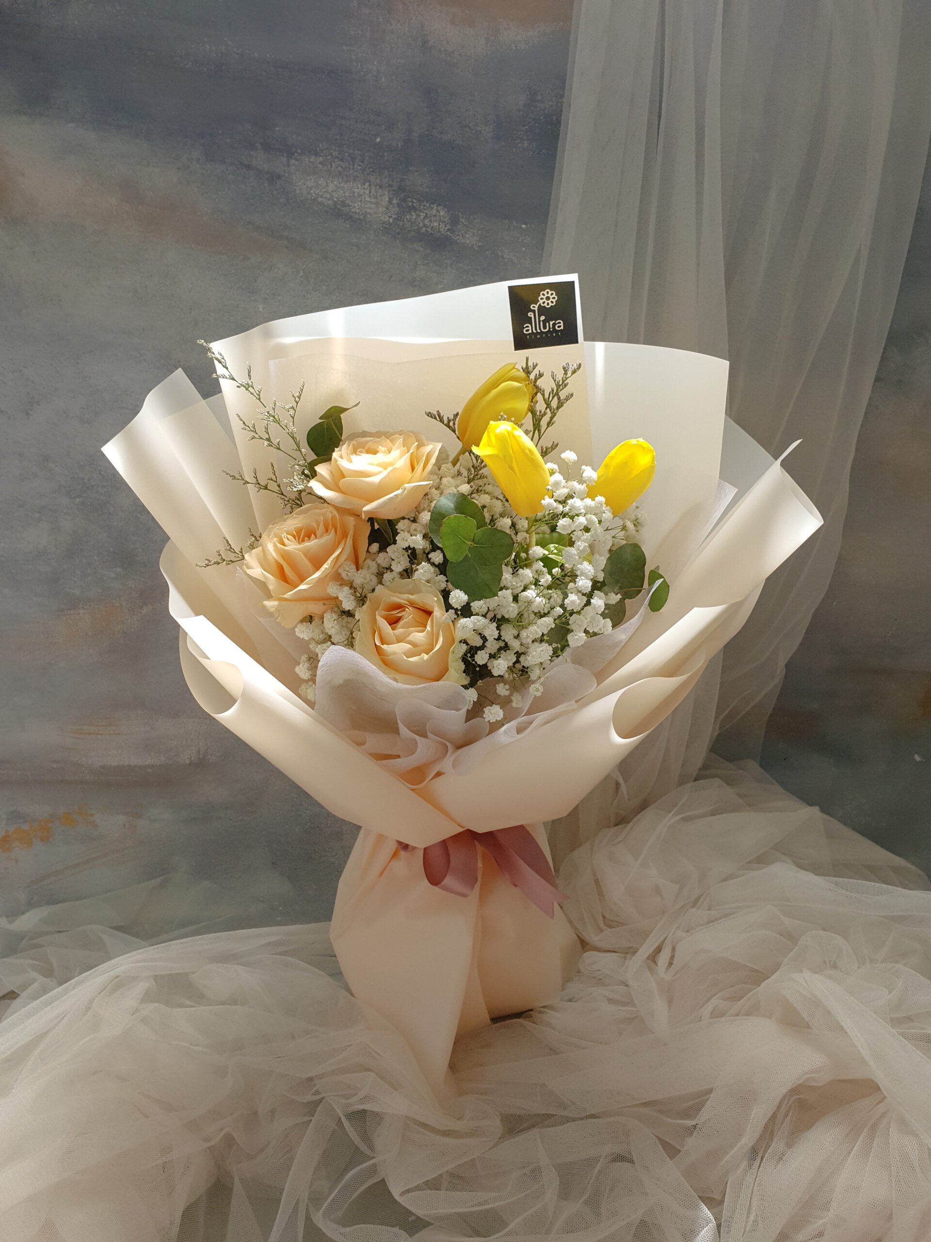Contain 3pcs rose and 3pcs Tulip with babybreath and foliages.