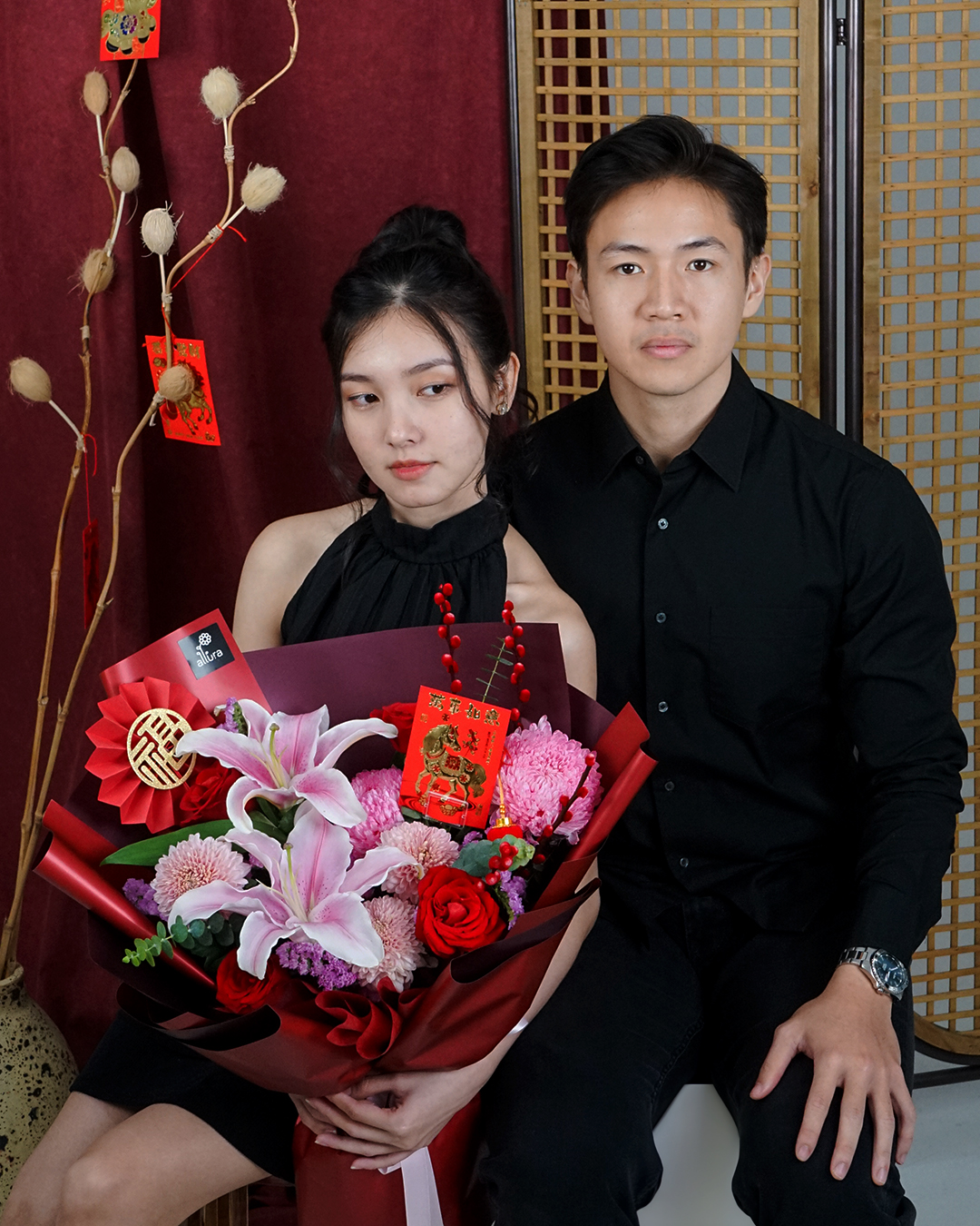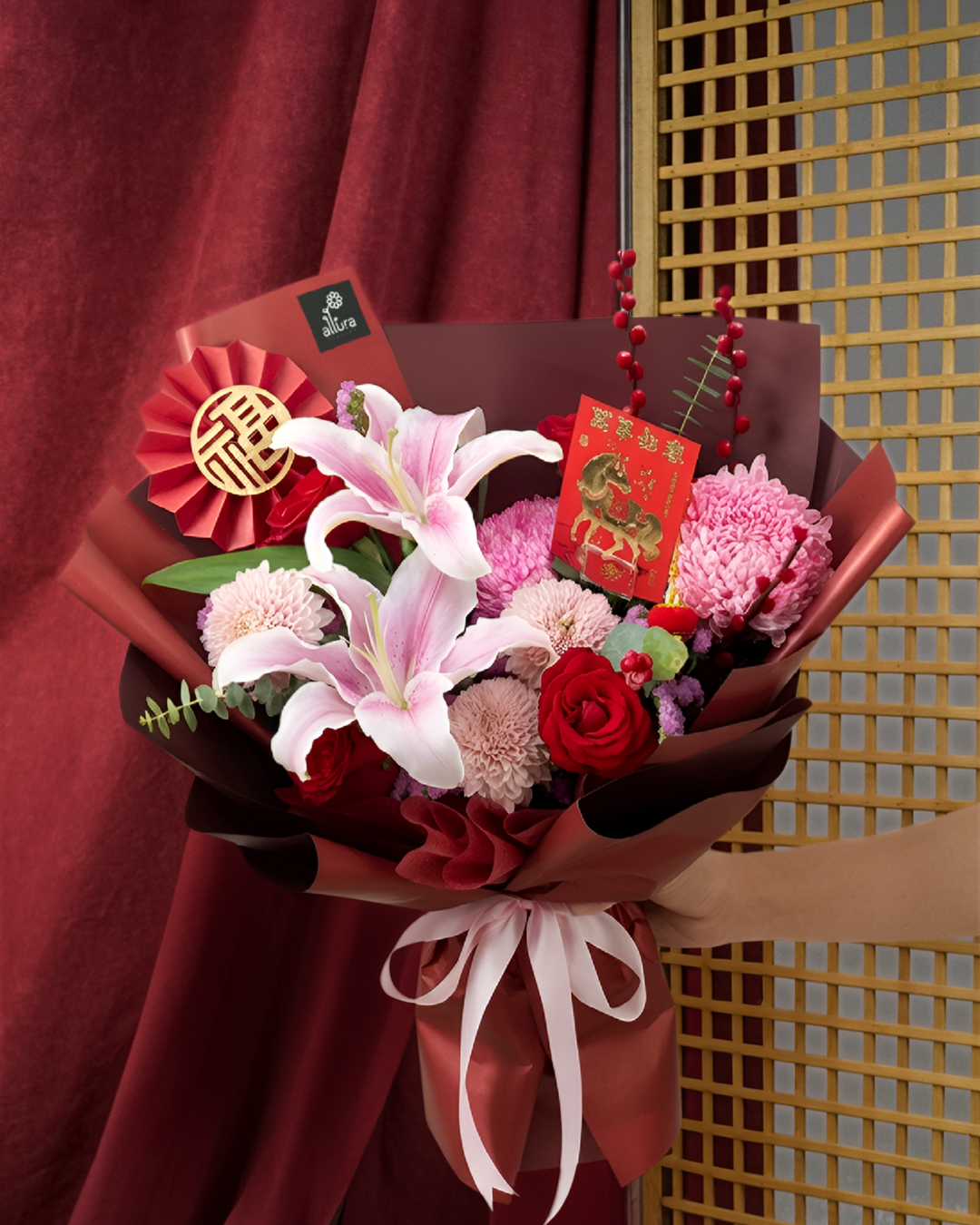 A Lunar New Year flower bouquet designed in festive red tones, symbolizing prosperity, good fortune, and new beginnings.