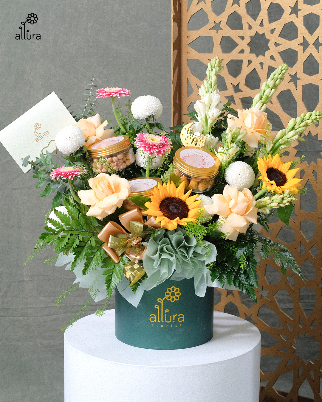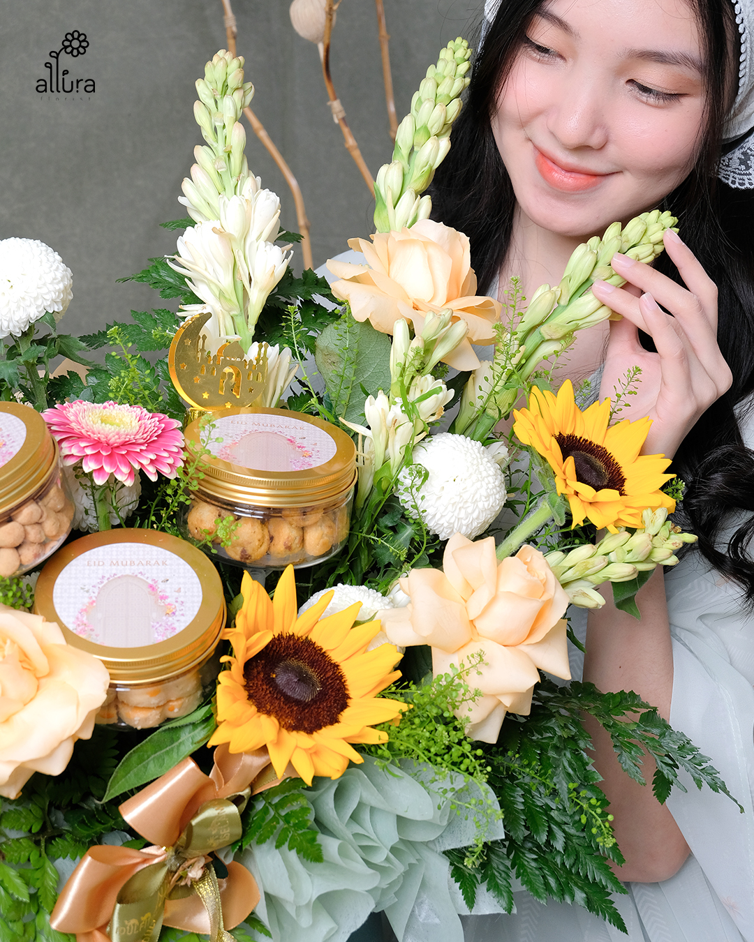 A refined Eid hamper combining premium festive treats with a beautiful fresh flower arrangement. Designed to bring warmth, sweetness, and elegance to every Raya celebration.