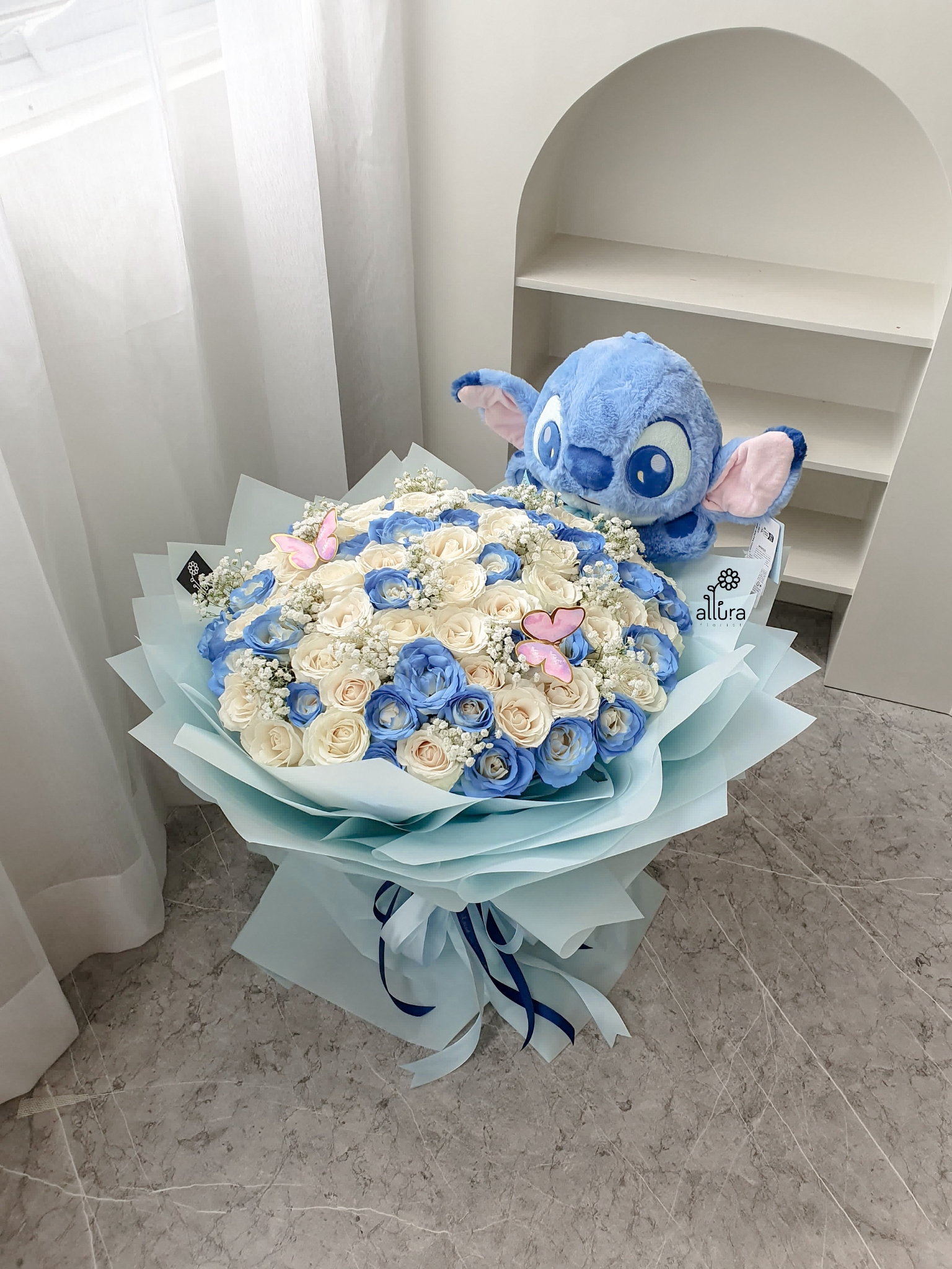 Beautiful 70pcs semiimport roses bouquet with Ecudaor babybreath, completed with Stitch Doll inside !