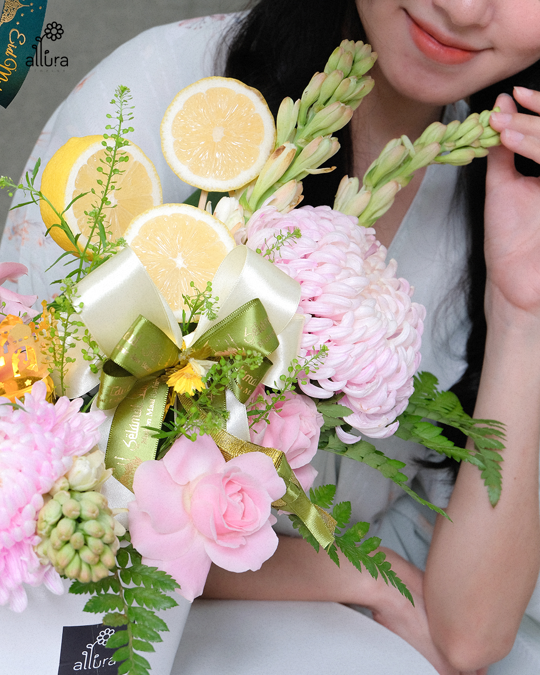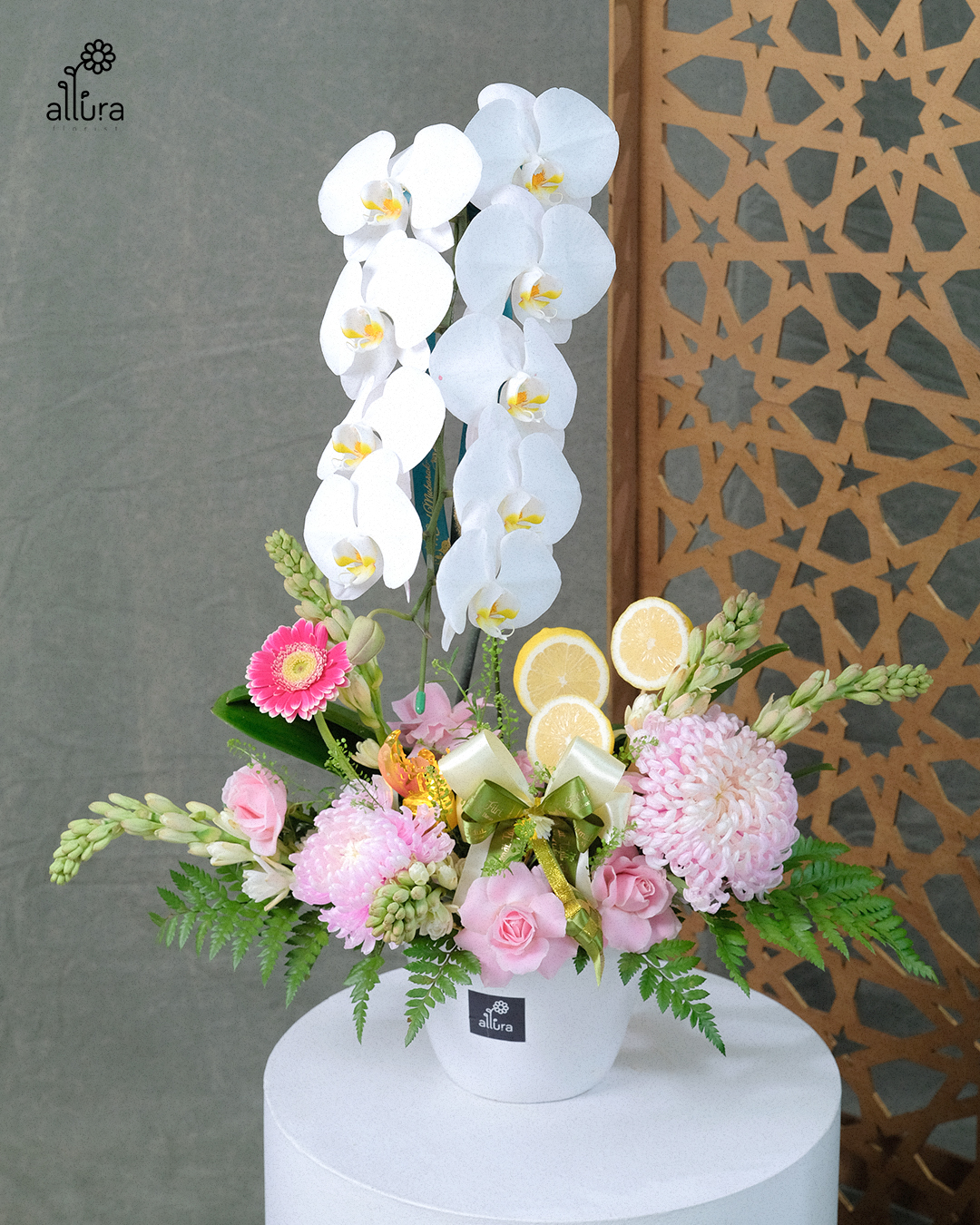 This elegant arrangement features single live orchid plants (lasting up to 1.5 months), complemented with fresh roses, tuberose, gompie, and daisies. Enhanced with fresh lemon slices, the blend of tuberose and citrus creates a refreshing, uplifting fragrance.
